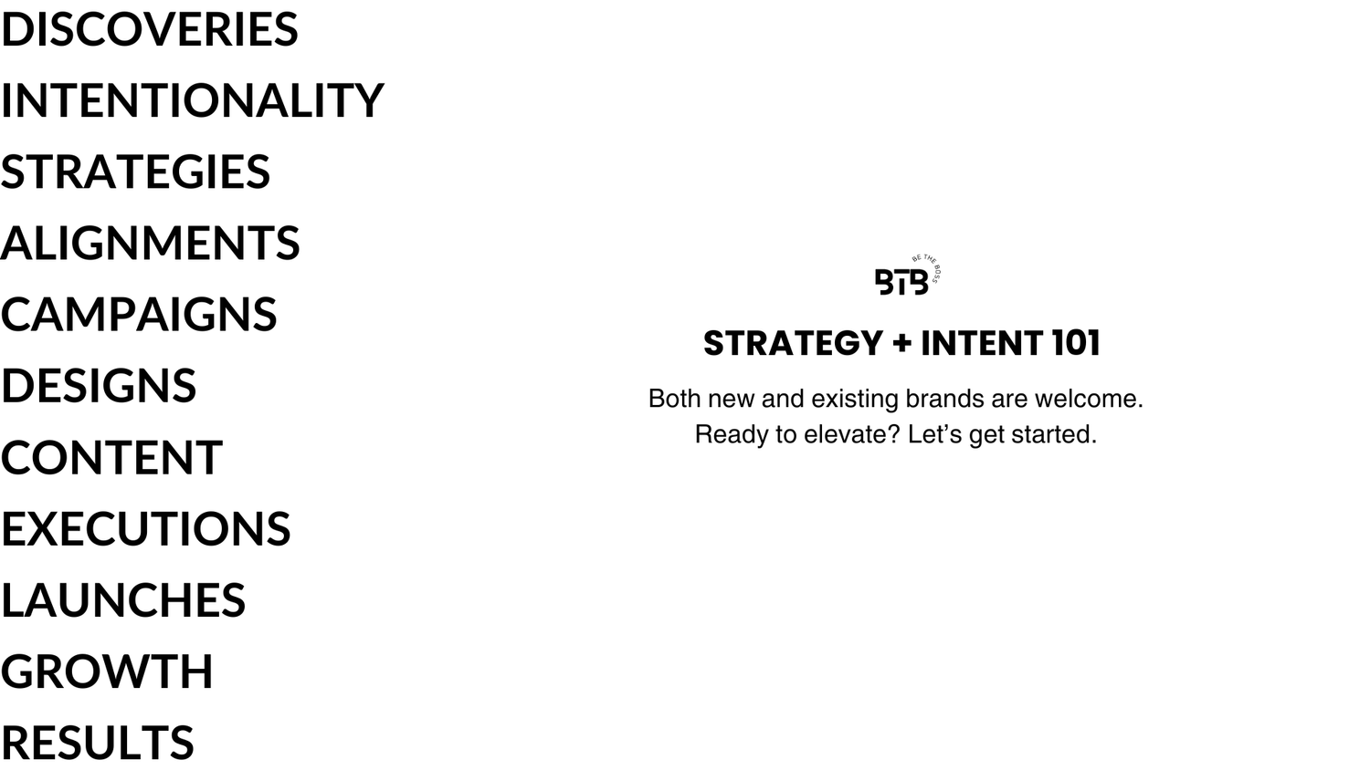 BTB exists to help you come up with a game plan so you can grow and build your brand(s) more confidently with custom, implementable, actionable elements, direction and strategies.